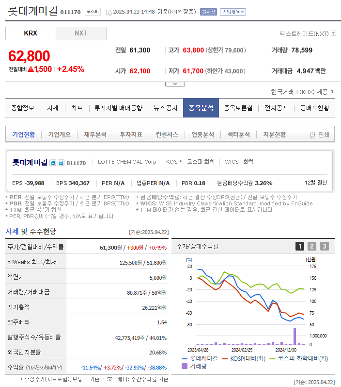 현재 롯데케미칼의 주가는 PBR 기준 약 0.4배로, 명백한 저평가 구간에 위치해 있습니다. 보통 PBR이 1배 미만이면 시장에서 ‘자산가치’보다 낮은 평가를 받고 있다는 의미인데요. 투자자 입장에서 이는 곧 하방 리스크가 제한적인 대신, 업사이드는 열려있다는 뜻이기도 합니다.